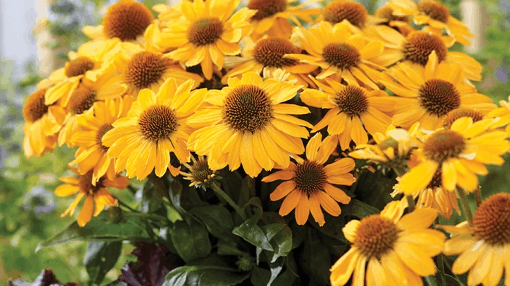 Echinacea ‘Tweety’ PP28952, which brightens any spot with its large, golden yellow flowers and compact habit. It grows to 8 inches tall and 6 inches wide. ‘Tweety’ stands out for its excellent pot performance but also excels in gardens and combinations. It prefers sandy, well-drained soil and full sun. ‘Tweety’ blooms from early summer to fall and is hardy to Zone 4.