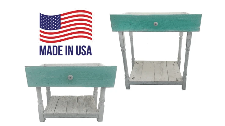 This pair of drawer planters is a whimsical accent for a porch or patio. White planters with a vintage turquoise drawer and white handle. Bottom wood shelf could hold a second planter or garden accent for that extra finishing touch! Solid wood construction. Amish-made in the USA!