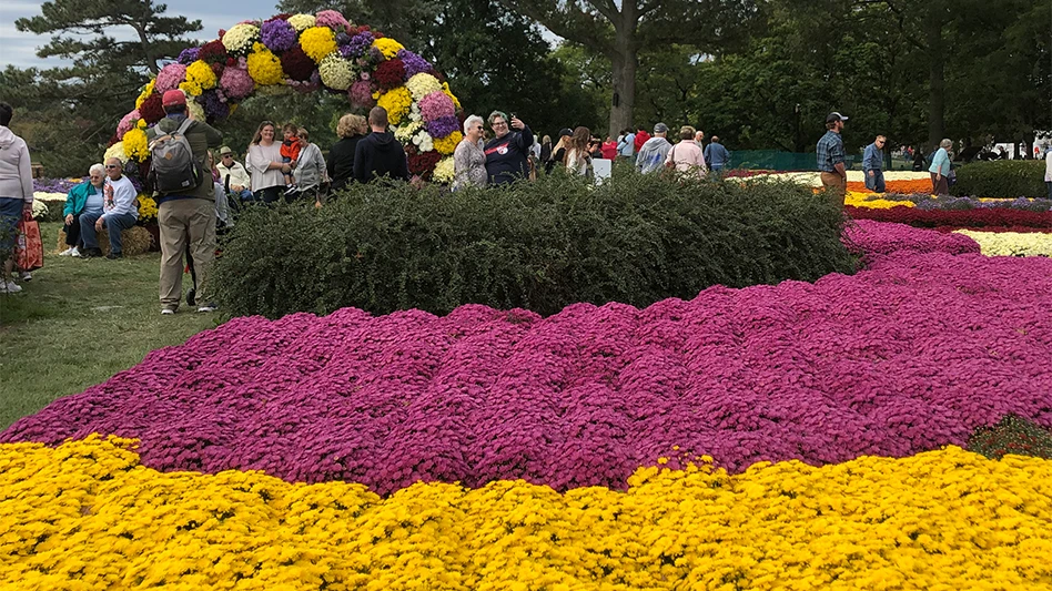2. & 3. Crowds gathered to take photos in front of the multi-colored Bonnie Joyce Myers Memorial Mum Arch and other Americana-themed mum displays.
