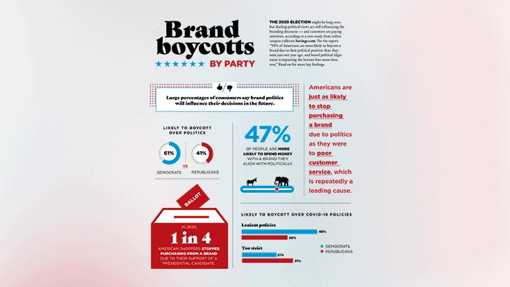 The 2020 election might be long over, but dueling political views are still influencing the branding discourse — and customers are paying attention, according to a new study from online coupon collector Savings.com.
