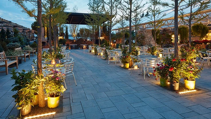 Outside the store is a lathe house where nursery stock is sold through a satellite location of KAT, the nursery-turned-landscape-distribution company Schwope started in his early 20s. High-quality materials from KAT, including Techo-Bloc pavers, were used to construct the store’s courtyard, which also features a stone fireplace and outdoor stage. Colonial hosts special events, seminars, and soon, weddings, there, plus the space serves as inspiration for landscape design customers who want to purchase materials. The Bean Counter Café, owned by Sara O’Bryan, who leases the on-site restaurant, can also be accessed from the courtyard.