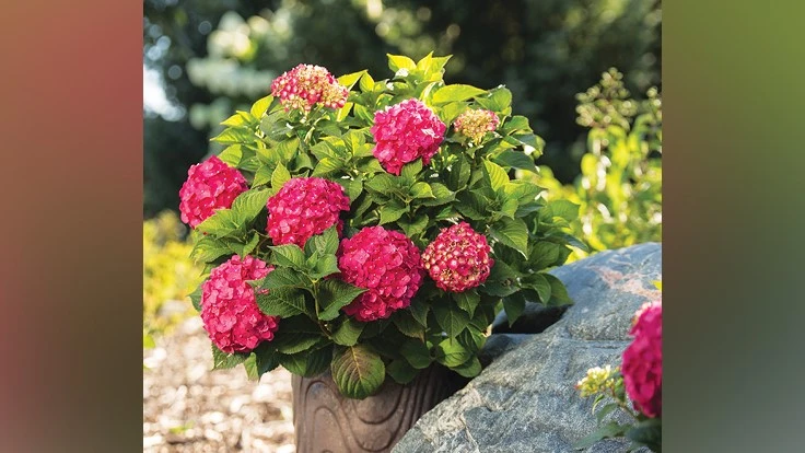 Summer Crush features raspberry red or neon purple blooms, a color breakthrough in reblooming garden hydrangeas. Bred by Bailey Innovations, this new addition to the Endless Summer brand is the result of focused breeding and years of production and field testing. This compact growing hydrangea, with dark green glossy leaves, fits smaller spaces in the garden and patio containers.