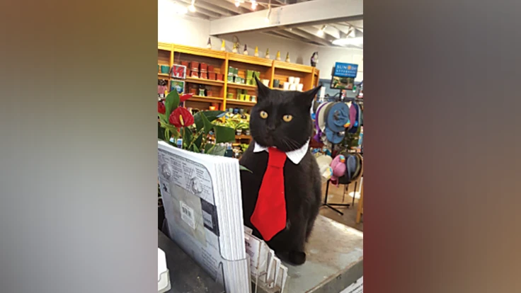 This adult black cat can usually be seen lounging on the counters and around the premises of Terra Sol Garden Center, says sales associate Claire Kinnahan.