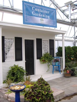 Noble Landscape & Garden Center uses a house façade to show the real-world possibilities for container gardens. The store took a cue from the surrounding neighborhood, and created a faux house-front that looks similar to homes in nearby subdivisions. |