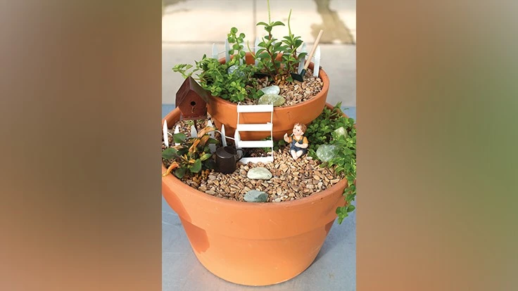 Morgan says an odd number of plants in a fairy garden “is visually more aesthetically appealing than an even number.” When selecting plants, she considers number, height, texture and color.