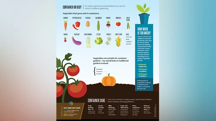 This spring, your store is likely to play host to a great number of home gardeners. Some of them may know what they’re doing and are gearing up for yet another season spent in the dirt, planting edibles for their home. On the other hand, you’re also likely to receive questions from first-timers and novice gardeners, who may want to start with a container before investing in a raised bed. You may also have some new seasonal staff members not familiar with home-grown food. With these quick and simple tips for starting and maintaining a home vegetable garden in a container, your seasonal employees will be equipped to get these customers started on a vegetable patch of their own. All tips and data courtesy of Fix.com/blog.