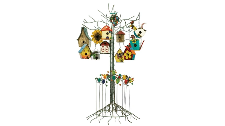 You can proudly display this amazing collection of vibrantly colored birdhouses hanging from our sturdy wrought iron display tree. At the base of the tree, you can see an assortment of beautiful bird stakes. The package includes: 40 Birdhouses (2 of each design) 24 Bird stakes in assorted colors 1 Display Wrought iron tree (50” x 50” x 87”)Take advantage of this incredible opportunity today and add a fresh splash of color and revenue to your business!