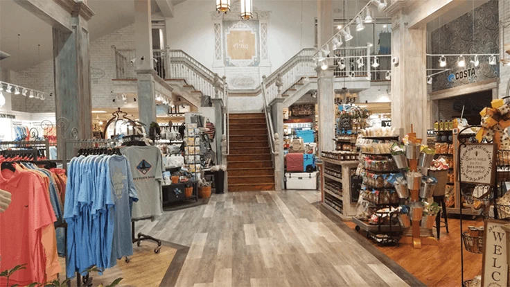 The shop-in-shops are custom-built and decorated for the purpose at hand. When changes happen, that can mean new rooms and walls or existing rooms completely gutted. A contractor works on site nearly full-time, and a local artist adds one-of-a-kind finishing touches.