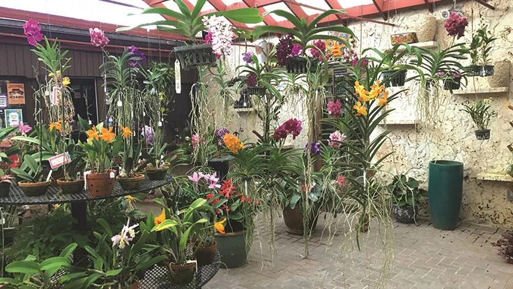 While the fact that Florida has the most native orchids compared to any other state in the continental U.S. may not be surprising, Robert Fuchs, president of R.F. Orchids, shared a tidbit that many on our tour did not realize — 49 states in the U.S. have native orchids; Hawaii is the only state that does not. Fuchs, who joined his family’s business in 1970 and restored the nursery after his father experienced health issues and passed away the year before, gave us a history of the property, which had to be rebuilt after Hurricane Andrew destroyed most of the property except for the house on the grounds in 1992. There was no evidence of this destruction during our visit, however. Fuchs showed us a range of orchids, from tiny Oncidium to giant Cattleya, which were displayed on tree trunks and branches that towered over beautiful gardens. We also got to peek into growing operations and see plants other than orchids on the property, including a vanilla orchid and a Zombie palm, (Zombia antillarum), which is native to Haiti and has a very distinct look, as it’s covered in spiny leaf sheaths.