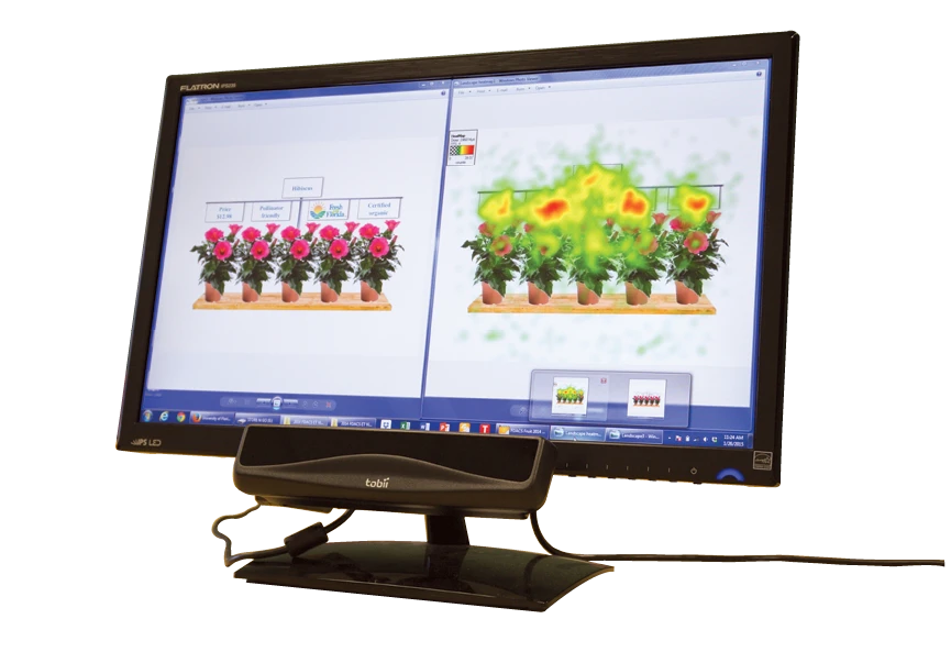 To measure what influences people to purchase plants specifically, in addition to surveys, the researchers used eye-tracking technology to see if they could determine what point-of-sale and display attributes appeal to subjects most by capturing what they focus on. Measuring what catches their attention is important, because to decide to buy a product, consumers have to first notice it in stores, either through merchandising or signs.