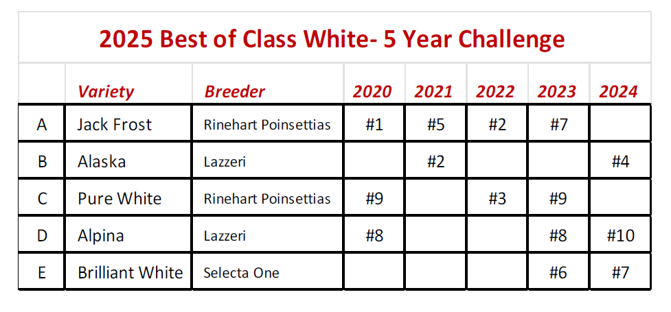 This year, a blind vote was conducted to determine the 2025 Best of Class White – 5 Year Challenge. This contest pitted the five top finishing white varieties in the non-red class over the past five years. The varieties were Jack Frost from Rinehart Poinsettias, Alaska from Lazzeri, Pure White from Rinehart Poinsettias, Alpina from Lazzeri and Brilliant White from Selecta One. In a close competition, Brilliant White garnered the winning vote count. Selecta won the award for the second year in a row, having won the Best of Class Red – 5 Year Challenge in 2024 with Noel Red.
