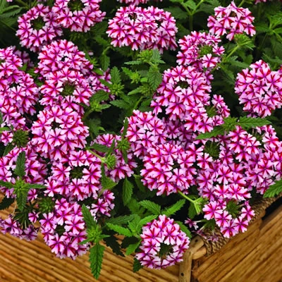 ‘Lanai Candy Cane’ offers a truly unique flower pattern which commands curbside attention. This striking striped beauty offers continuous summer blooms stacked atop a well-balanced plant habit. Candy Cane was selected from a strong and proven family of verbena varieties with superior weather tolerance.