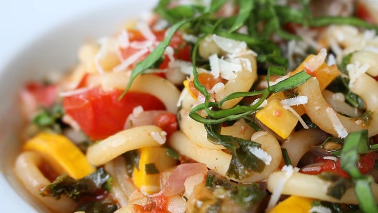 Minestrone Pasta (featuring Prism kale, Mad Hatter peppers, Seychelles pole beans and Chef’s Choice Yellow tomatoes)
