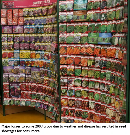 Barbara Melera, owner of D. Landreth Seeds in New Freedom, Pa., told the Baltimore Sun that consumers may have a hard time finding some kinds of vegetables seeds this year, particularly cucumber and onion sets. She said the reason is that 2009 was one of the worst growing seasons ever. The loss of crops due to excessive rain and disease resulted in major losses.