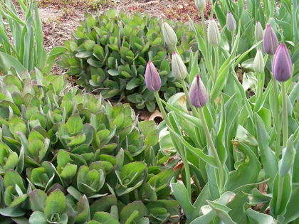 * Tulipa 'Queen of Night' with sedum 'Matrona' (pictured) – The purple tulip flowers complement the purple-edged foliage of the sedum to make a truly wonderful spring display. The deep, dark purple of the almost-black tulip flower echoes the hues of this dark-leaved sedum. The sedum then grows large enough over the season to overtake the old tulip foliage. This combo would be effective with any upright, dark-leaved sedum.