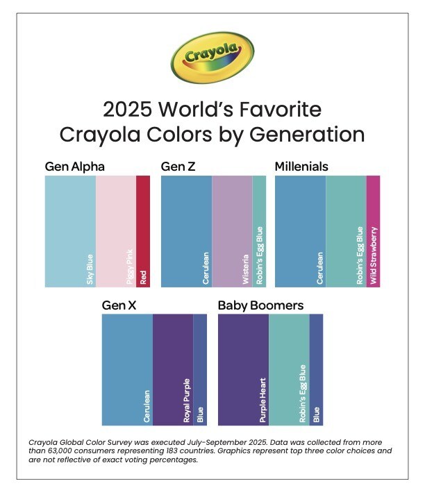 The survey helped shape a new color pack inspired by the most-loved shades. The "World's Favorite Colors" special collection crayons, markers and colored pencil packs, activity kits and themed coloring books will be available in retailers this holiday season and early 2026.