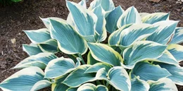 ‘First Frost’ is a frosty white-edged sport of ‘Halcyon.’ Blue leaves emerge with a wide margin the wonderful color of the center of ‘June,’ another ‘Halcyon’ sport and 2001 Hosta of the Year, and then turn pure white if grown in half a day of bright light. Lavender flowers bloom in July. It has excellent color and substance, and will look unblemished in the garden until the first frost.