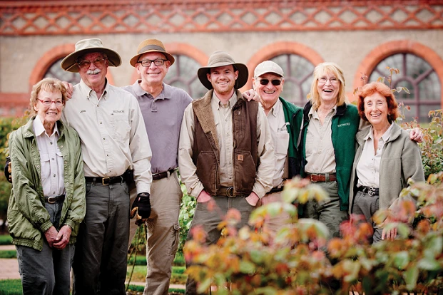 Photo: Max Cooper Photography. Biltmore rose garden crew, from left to right: Aileen Black, John Smith, Paul Zimmerman, Jon Parker, Duane Bateman, Kaye DeBona, and Joan Glacken.