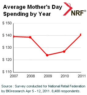According to NRF’s 2011 Mother’s Day Consumer Intentions and Actions survey, conducted by BIGresearch, the average person celebrating the holiday is expected to spend $140.73 on gifts, up from $126.90 last year, and a return to 2008 spending levels. Total spending is expected to reach $16.3 billion.