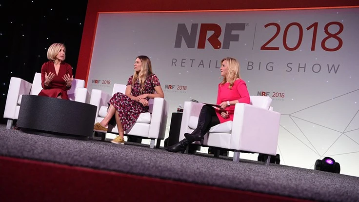 Image caption: Jennifer Jolly, nationally syndicated tech-life columnist, far right, interviews Tyler Haney, center, founder and CEO of Outdoor Voices, and Marne Levine, left, COO of Instagram, during a session at NRF 2018 Retail's Big Show. Photo courtesy of NRF.