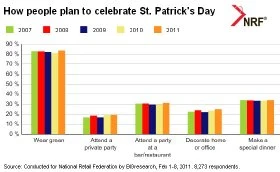 According to NRF’s 2011 St. Patrick’s Day Consumer Intentions and Actions survey, 52.4 percent of Americans will celebrate the holiday. This is up from 45.2 percent last year and is the largest number in the survey’s eight-year history.