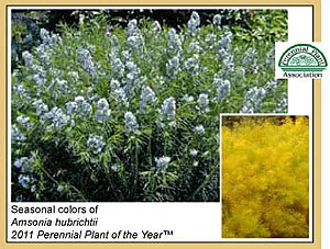 The Perennial Plant Association has named Amsonia hubrichtii as the 2011 Perennial Plant of the Year. "Arkansas blue star" and "thread-leaf blue star" are common names for the perennial, which grows 36 inches tall and 36 inches wide in a mounded form. The multi-season perennial has blue flowers in late spring to early summer and a bright yellow-golden fall color.