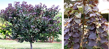 'Ruby Falls' (pictured, right) has large heart-shaped purple foliage. Breakthrough breeding has produced the first purple redbud developed with a unique weeping habit. It is the perfect weeping tree for smaller yards and also suitable for large patio containers.