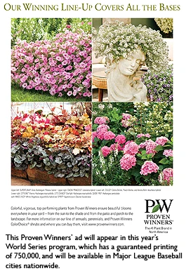 In its continuing efforts to have a presence at marquee events, Proven Winners will have an ad running in this year’s World Series program. Proven Winners director of marketing Marshall Dirks said the program will have a guaranteed printing of 750,000 copies. The program will be available in all the Major League Baseball cities at various outlets, including Barnes & Nobles, Borders, Walmart, Kmart, supermarkets, and newsstands in airports and train stations.