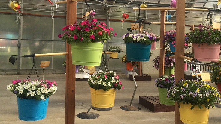 We headed through the hills to arrive at our first destination for Day 5 of the California Spring Trials — Syngenta Flowers. We could sense the "buzz" from the moment we walked into the greenhouse and saw bee-themed decor and a live bee colony, a sign of the company's emphasis on pollinator-friendly plants this year. Throughout the stop, Syngenta simplified the information about varieties, research and concepts for industry members by displaying double-sided signs that honed in on particular areas of interest. For example, one side might have grower-specific production information, while the other might show charts and statistics from the latest research. Speaking of research, we spoke with Alicain Carlson about the work being done with the photoperiod of petunias. See "Lighting a path" for more.
