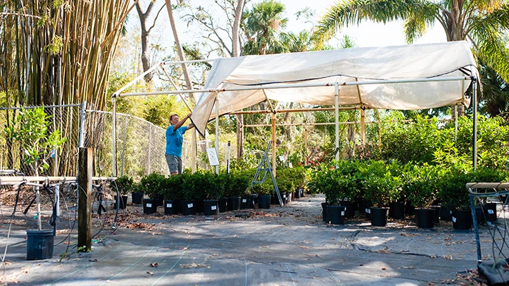 Pictured above: Chuck Walker, staff member at Lindley's Nursery & Garden Center in New Smyrna Beach, Fla., repairs an awning during the retailer's recovery from Hurricane Irma. Photo by Laura Yang.
