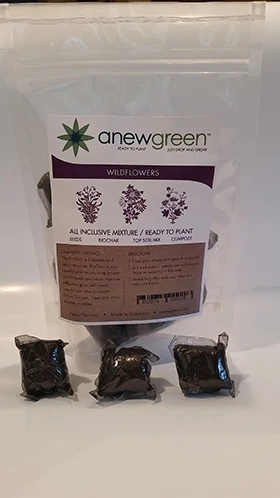 Garden Pacs contain seeds and the exact amount of soil, compost and fertilizer gardeners need to get a plant started. All customers need to do is drop a Pac where they want the plants to grow and add water. Each Pac contains the appropriate amount of seeds for each type of garden plant and the bag will display the recommended spacing. Anew Green also offers grass and flower Pacs with native grasses and wild flower varieties.
