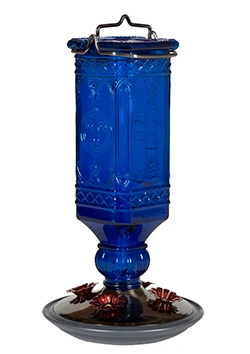 The new line of Perky-Pet Antique Bottle Hummingbird Feeders offers bird enthusiasts even more variety when shopping for glass feeders. Each feeder includes a hardened glass bottle nectar container available in cobalt blue, red, or green. Each feeder contains four decorative flower feeding ports, an attached metal hanger, and a brushed silver or copper base that easily detaches from the nectar container for quick, simple cleaning.