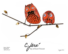 Role Model features two vividly colored owls perched upon a tree branch. As its name suggests, the piece provides a glimpse into the story of an elder owl mentoring his junior. Made of painted steel, all finely detailed elements pop with the creative use of colors and texture.
