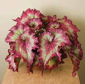 ‘Raspberry Torte’ is a new Logee’s exclusive begonia with spiraled leaves that show off bands of silver and raspberry. The serrated leaf edges undulate with color, and the black-to-green veining gives the plant dimension and texture. The short leaf stems make this compact grower a prized begonia for any partially sunlit windowsill. ‘Raspberry Torte’ grows to about 12 inches tall and does best when temperatures are 60 degrees and warmer.