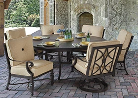 Pride Family Brands’ Bellagio Cushioned Dining Set incorporates intricate details throughout. A weather-resistant aluminum construction includes original cast leg details in an Empire style that culminates in the cast “feather” curving arm. The seat back includes a center design pulled together with a decorative cast medallion. All cushions are constructed of weather-resistant fabric and tailored with welting and Pride’s signature cast aluminum center button tuft. Standard and swivel seating is available for the dining set. The cast aluminum table, available in multiple cast top designs, seats any large gathering. All furnishings feature a four-stage finishing process and hand applied antiquing.