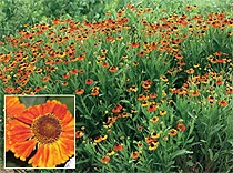Blooms of Bressingham has introduced Helenium Mardi Gras. This striking plant produces a riot of multicolored blooms for six to eight weeks in summer, from late June to early August. Yellow petals, lavishly splashed with orange-red, form wildly patterned stiff skirts around deep brown, mounded center cones. The "tie-dyed" flowers are 1½ to 2 inches (3-5 cm) in diameter.