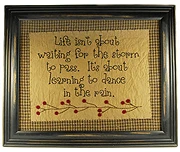 The Dance in the Rain Sampler from Blossom Bucket is a new 2010 installment in a long line of uplifting samplers designed by Barbara Lloyd. It measures 13.75 inches H x 16.5 inches L. Blossom Bucket offers an array of inspirational wall hangings, as well as a variety of seasonal and every day home decor items.