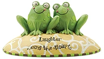 New from designer Tina Ledbetter comes a line of likeable critters created to increase your sales by leaps and bounds. Blossom Bucket's "Laughter Warms the Heart" Frogs will hop to the top of your best-sellers list in no time. Handcrafted resin frogs on base measure 5 inches L x 2.5 inches H.