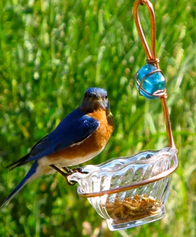 Birds Choice bluebird feeders, hand-made in the USA, are made out of copper and the hanging models have a beautiful blue stone. The feeders attract bluebirds and all come with a decorative plastic cup that is easy to clean and fill. The three versions include: one cup hanging, two cup hanging and one cup window-mount. Pictured is the one cup hanging version.