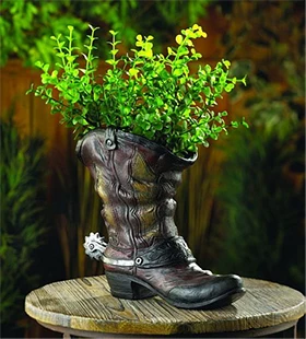 Flowers and plants can saddle up in this charming cowboy boot planter. This planter has plenty of western flair and looks like a well-worn and weathered boot, complete with a spur on the back. There is also a small hole at the bottom for drainage.