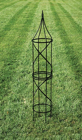 Solid Steel Obelisk Tuteurs are enlivened with dramatic swirls. Perfect for rose and clematis combos or many delightful climbing vines. Powder coated black. Shipped knocked-down and easily assembled. Available in new 84 inch tall by 14.5 inch diameter and 60 inch tall by 10.5 inch diameter sizes as well as the 72 inch tall, 13 inch diameter size.