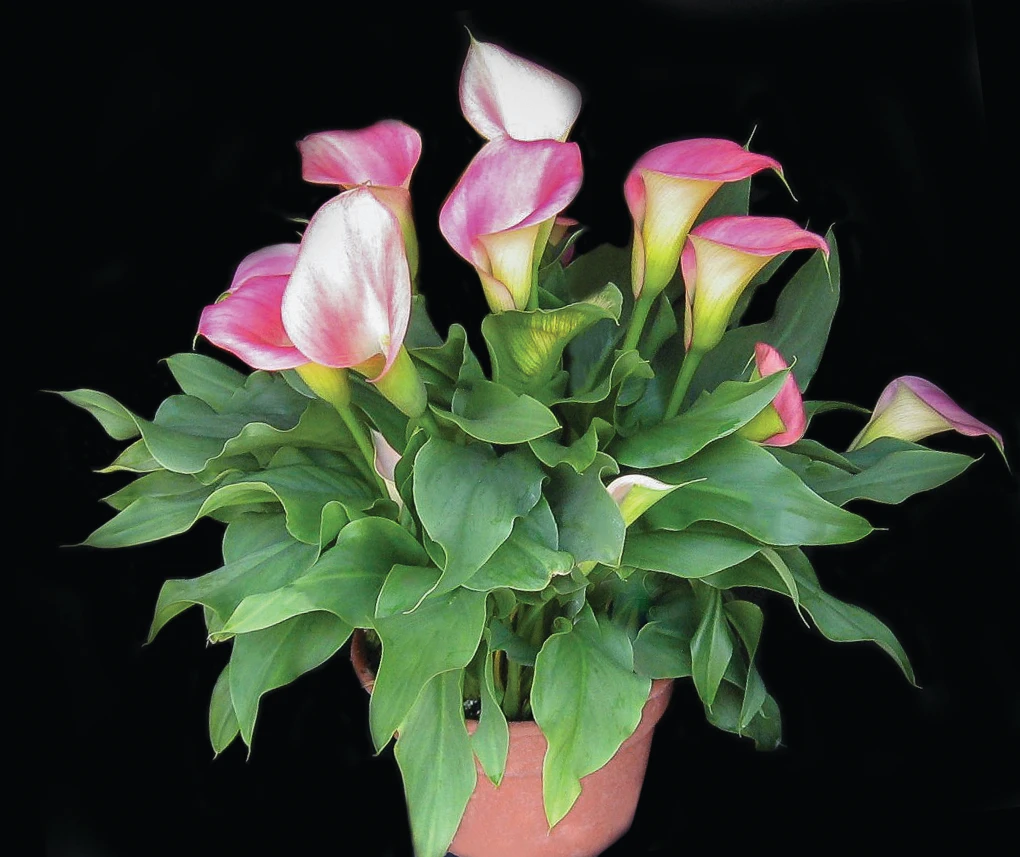 Callafornia Callas 'Peach Pazazz' produces large, peach-colored blooms whose color intensifies with age. The blooms are perched just above the matte foliage. The overall effect is one of a living bouquet. 'Peach Pazazz' is highly floriferous and best-suited for pot production.