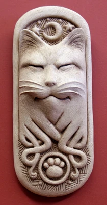 The Midnight Celtic Cat wall plaque from Carruth Studio measures 3¼ inches x 7½ inches x 2 inches and weighs 1.5 pounds. It has a hook on the back for hanging indoors or outside year-round. It is weather-proof and comes in natural stone, aged stone (pictured) and designer white.