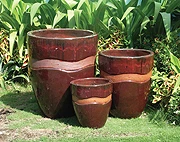 Ceramo Company markets a vast line of elegant decorative containers, including this Zaftig Trim planter set. Pottery is available in red clay, black clay, cast iron, rustic and aged, and glazed. The company regularly introduces new types of pottery and has something to fit practically any setting.