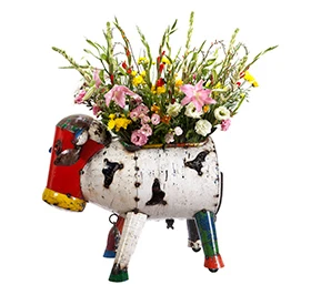 Clarence the Cow Planter is 100 percent derived from 44 gallon oil drums and has a hollow mid section, with a drainage plug with metal gauze cover. It also has wheels on its back legs for easy moving. It is part of an eclectic range of handmade sculptures that are full of fun and character and give a fresh new look to recycling.