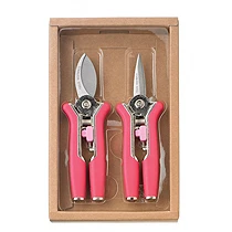 The Clarington pink mini pruning set is a feminine and functional tool for gardeners. The set offers long bladed pruners for dead heading and bypass pruners for normal cutting back.