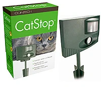 The CatStop motion-activated outdoor cat deterrent device from Contech can help restore neighborhood harmony while protecting birds and gardens from the natural instincts of cats. It detects motion within 280 square feet and emits a loud burst of ultrasonic sound audible only to cats. In short order, cats realize that CatStop-protected-areas are off-limits.