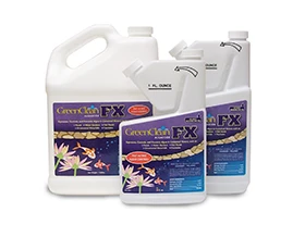 GreenCleanFX is ideal for green water algae and deeper water as it sinks to the bottom. It will not affect pH levels and continues to work up to 48 hours after application. GreenCleanFX is an activated peroxide commercial strength liquid algaecide, which means no harsh chemical in your customer's pond. GreenCleanFX meets the National Organic Program Standards for sustainability, is EPA registered, and is made in the USA. The product is available in 16 fl. oz. and 32 fl. oz Tip ‘n’ Pour containers with 1 oz. free and 1 gallon size.