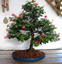 Calliandra emarginata 'Dwarf Powder Puff' from D&L Bonsai Nursery makes a great flowering bonsai with continuous blooms of red pom-poms that form from raspberry shaped buds. New growth emerges in a light burgundy color.