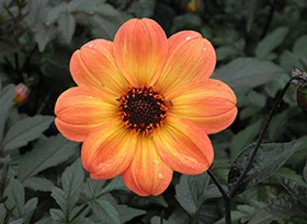 Unique sun-kissed apricot-orange blooms with soft yellow halos and dark central disks make ‘Mystic Haze’ a perfect plant for fall. The flowers in the Mystic Dahlia series are set apart from other dahlia varieties by their fashionable filigreed deep mahogany to black foliage topped with vivid blooms. Unlike their forebears, they do not require staking. These are strong hardy plants with a profusion of blooms that appear early summer through fall. Plants are hardy in zones 9 to 11.